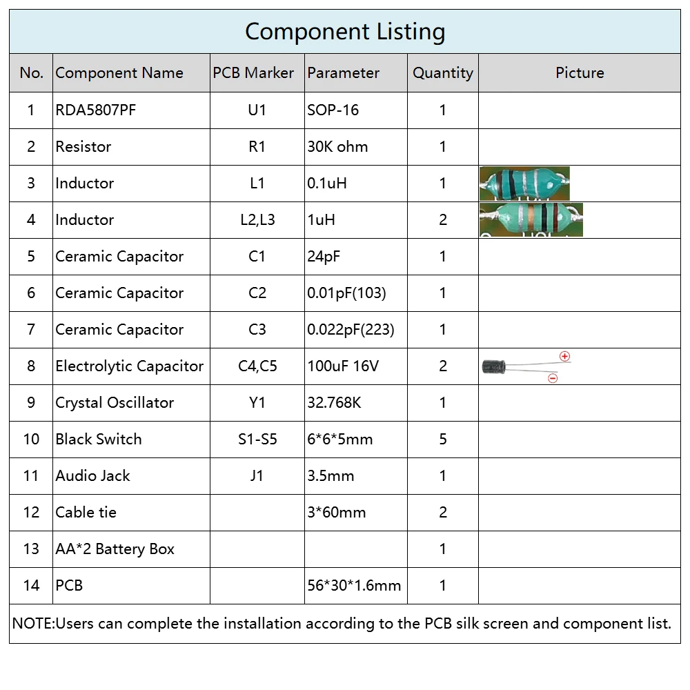 1>.Step 1: Install 1pcs SOP-16 RDA5807PF at U1.There is a dot on one corner of the IC and there is a rectangle pad on PCB where the Pin1 of IC can place on.These two marks are corresponding to each other and are used to specify the installation direction of the IC.