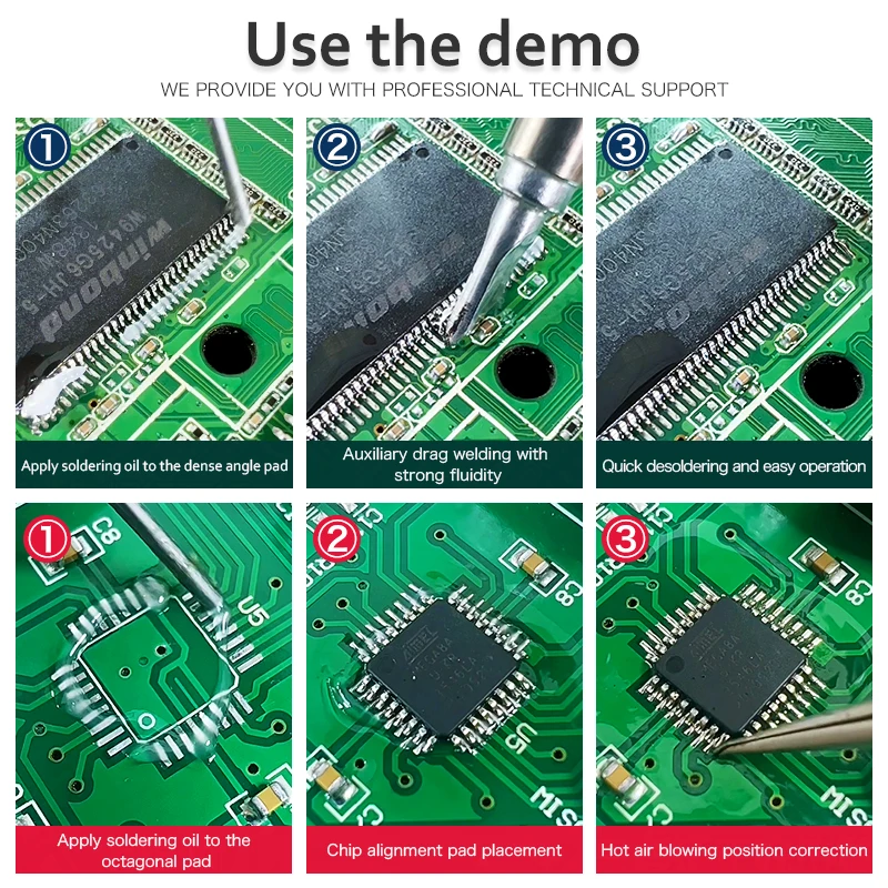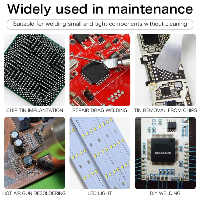 The milky white paste has a thick consistency, and has excellent effects in the repair of mobile phones and digital products. It has a light smell and a small amount of smoke, which is acceptable to experienced repairmen. It is lead-free and halogen-free and suitable for repairing mobile phones and digital products