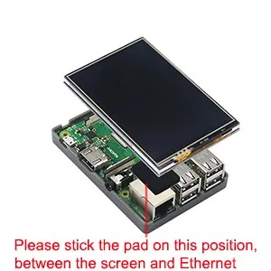 2). Please stick the pad on the back of 3.5 inch touchscreen ( as the picture show ) , then insert the 3.5 inch touchscreen on Raspberry Pi by GPIO pin correctly ( don't be malposed )