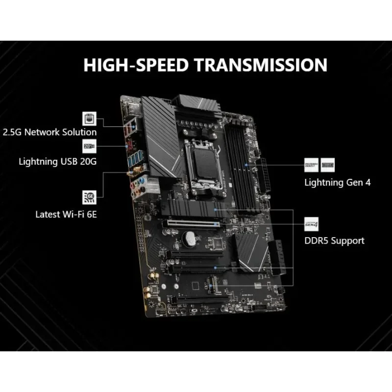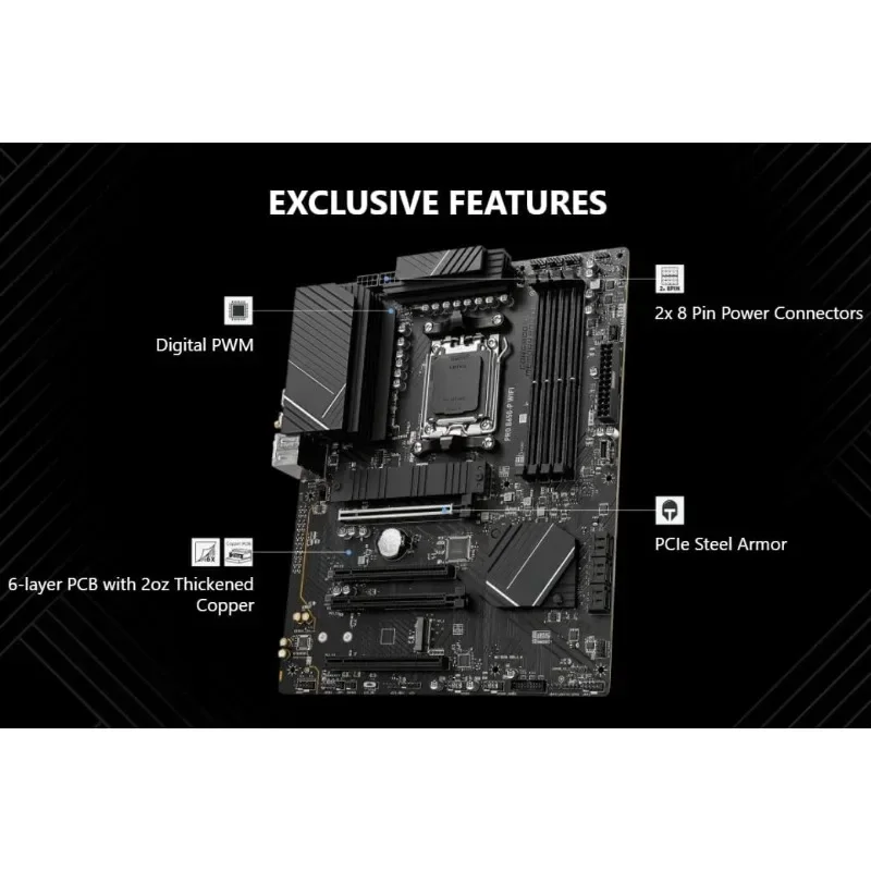 MSI PRO B650-P WiFi ProSeries Motherboard, ATX Form Factor, AM5 Socket. Supports DDR5 Memory, Dual Channel DDR5 6400+MHz (OC), Maximum Memory Capacity 256GB, 2 x M.2 PCIe 4.0 x4 slots, 6 x SATA 6Gb/s ports, USB 3.2 Gen 2x2, Wi-Fi 6E, 2.5G LAN. Supports 7000/8000/9000 Series Desktop Processors